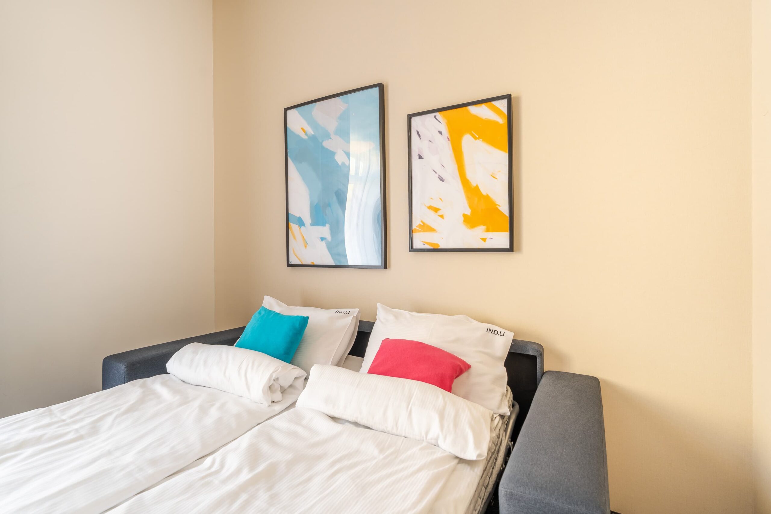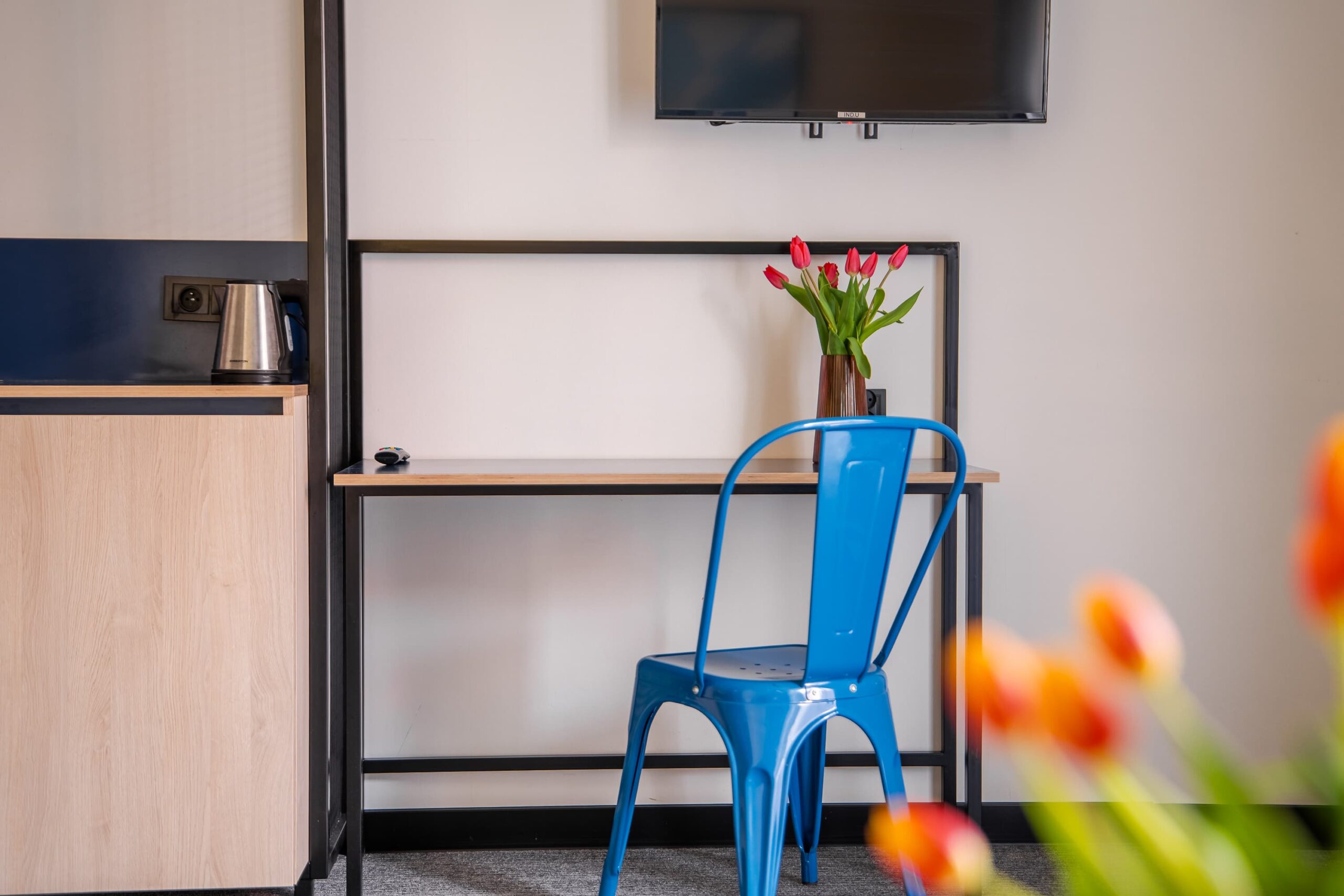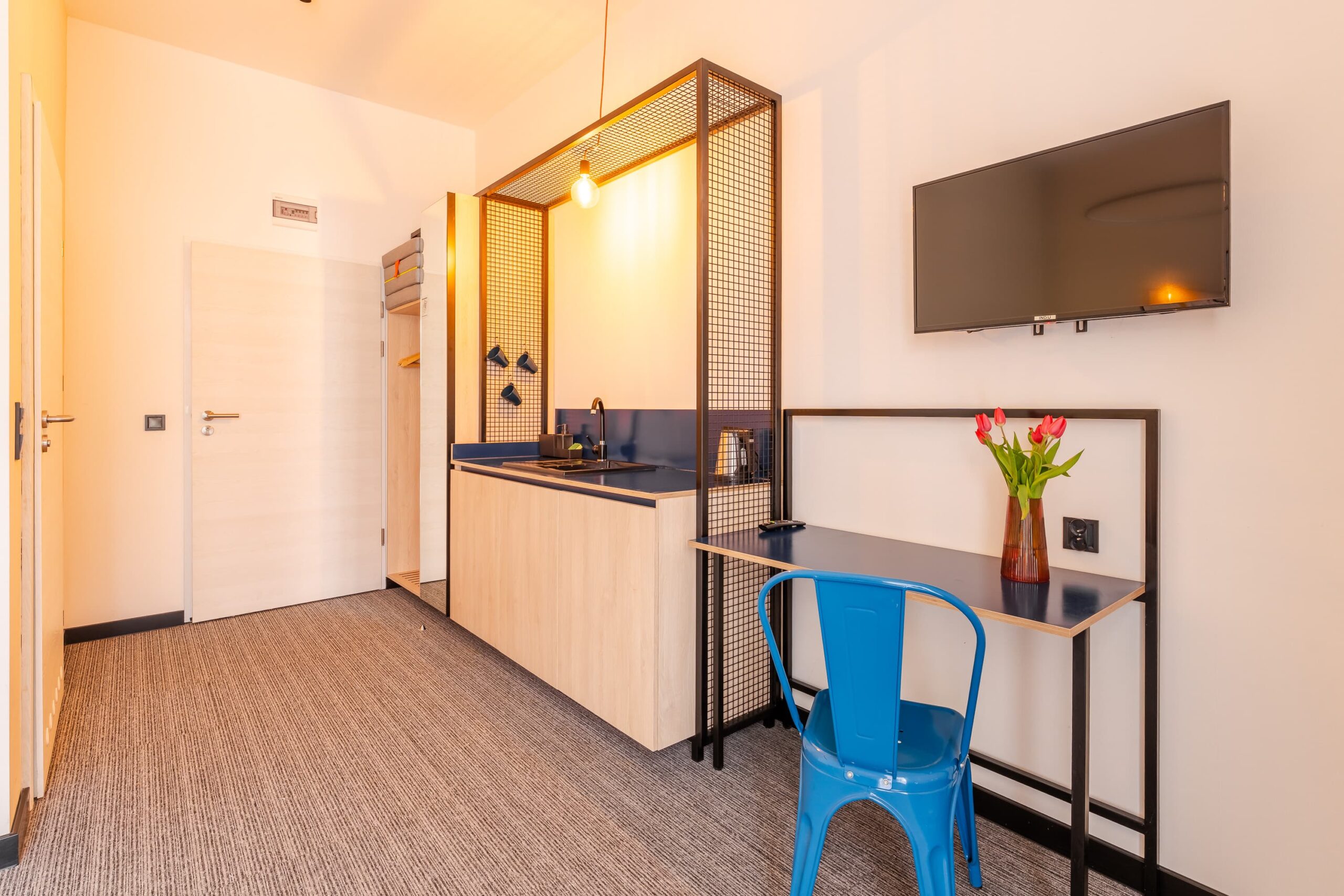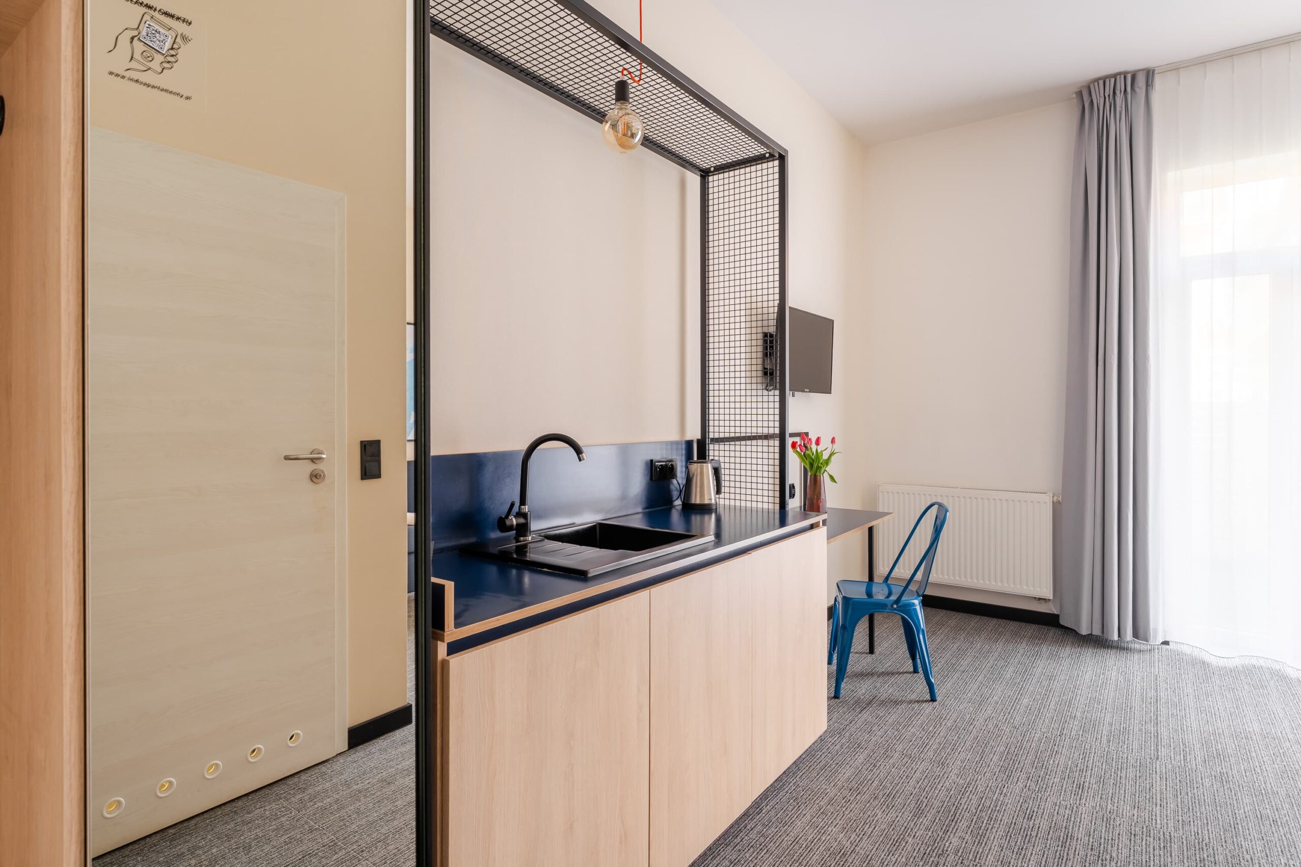 W pokoju znajduje się, lodówka, aneks kuchenny, telewizor z płaskim ekranem i dostępem do telewizji kablowej oraz łazienka z prysznicem. Rozkładana sofa z materacem to idealne rozwiązanie dla mniejszych przestrzeni. Dzięki temu po rozłożeniu mamy wygodne dwuosobowe łóżko.
