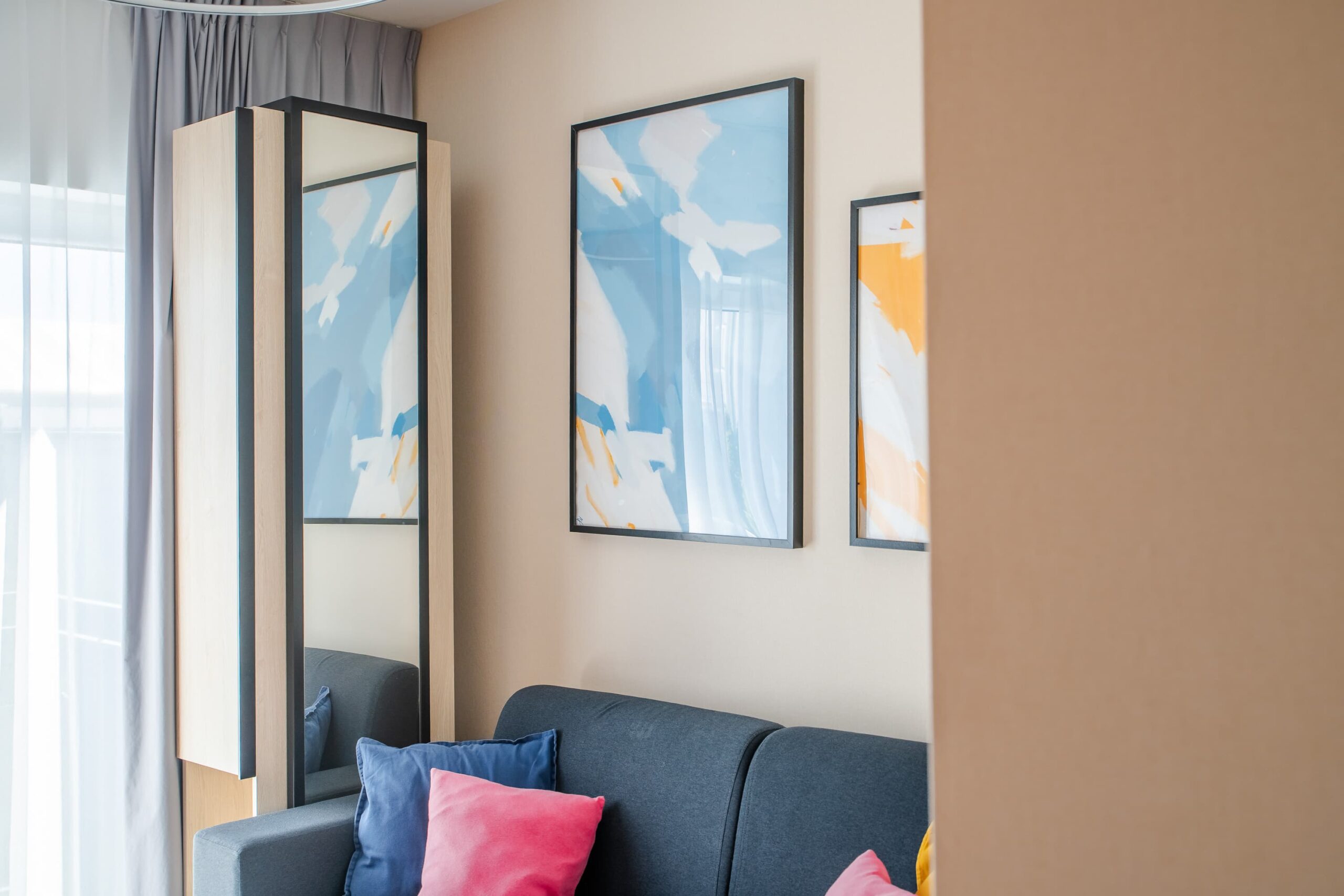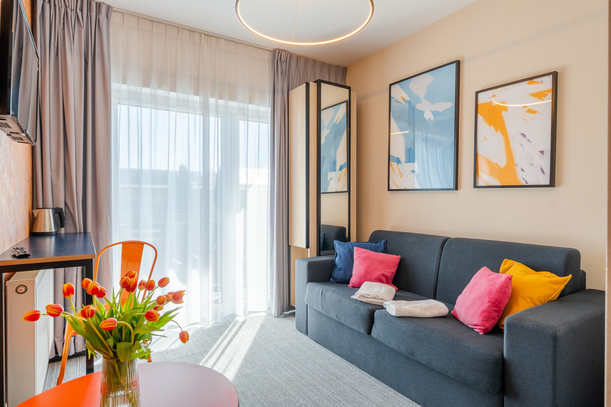 Das Zimmer verfügt über einen Flachbildfernseher mit Kabelkanälen und ein Badezimmer mit Dusche. Das Schlafsofa mit Matratze ist eine ideale Lösung für kleinere Räume. Dank dieser haben wir nach dem Ausklappen ein bequemes Doppelbett.