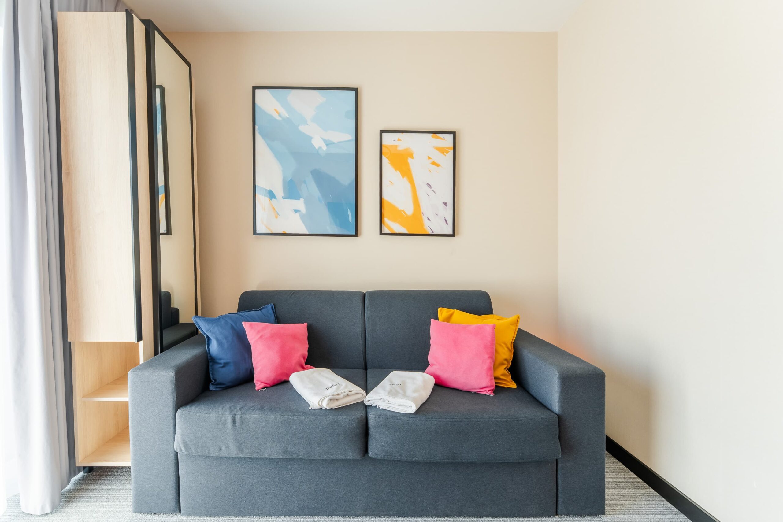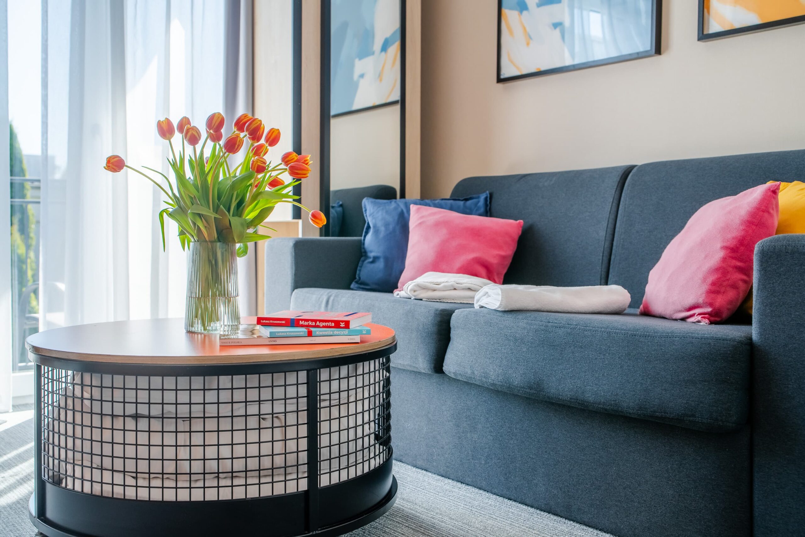 The room has a refrigerator, kitchenette, flat-screen TV with cable channels, and a bathroom with a shower. The sofa bed with a mattress in the living room is an ideal solution for smaller spaces. The bedroom has a comfortable double bed.