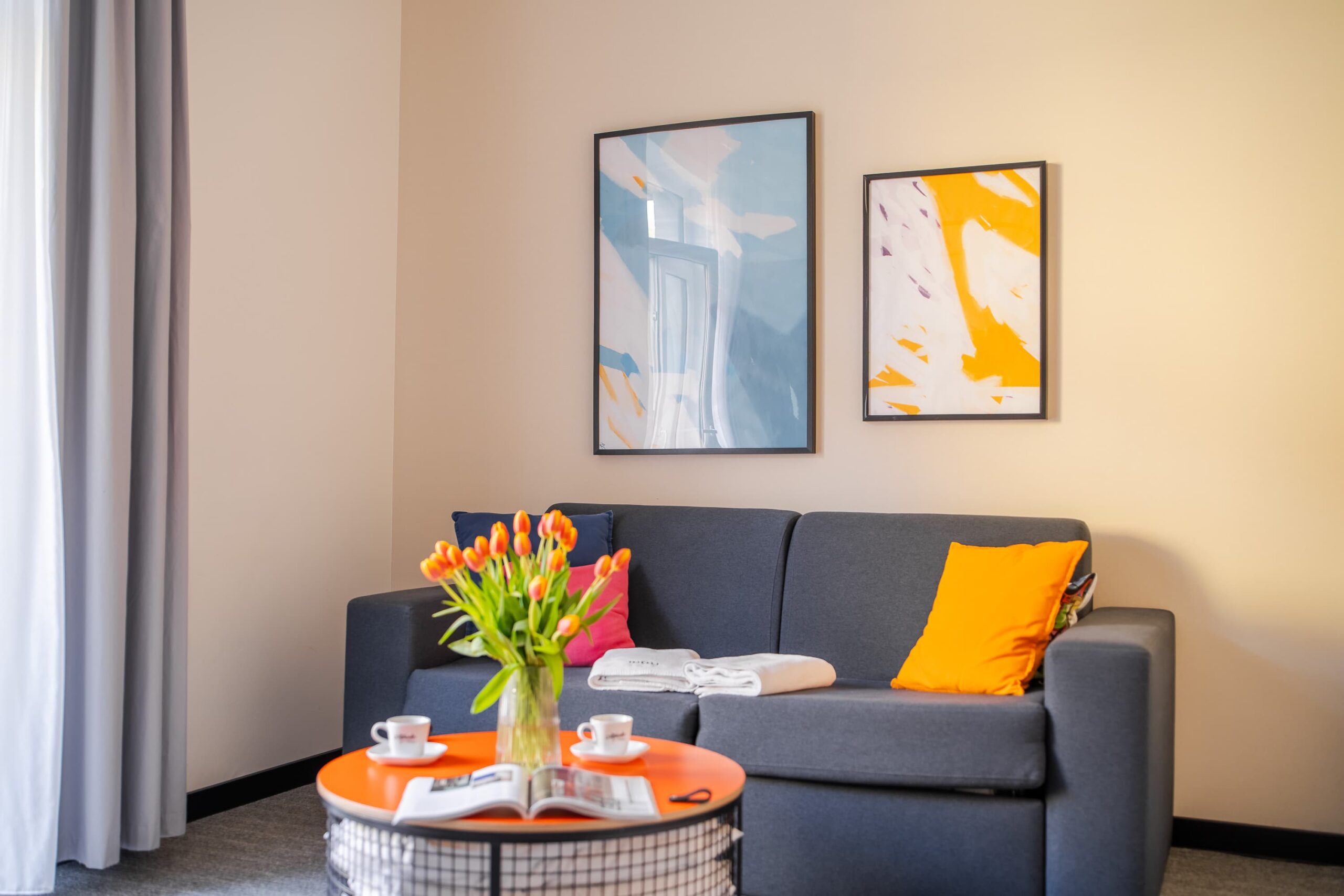 The room has a refrigerator, kitchenette, flat-screen TV with cable channels, and a bathroom with a shower. The sofa bed with a mattress is an ideal solution for smaller spaces. Thanks to this, we have a comfortable double bed after unfolding.