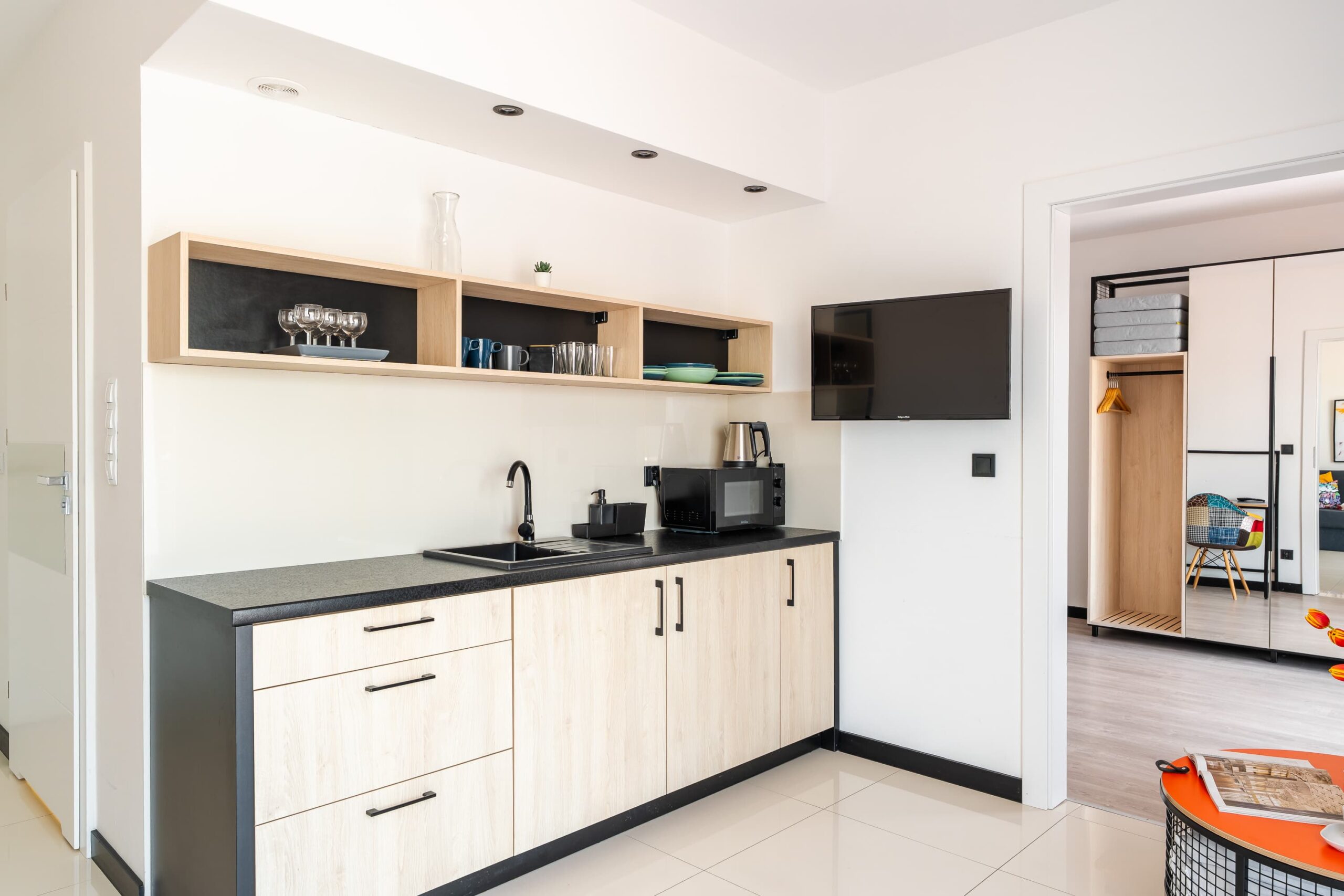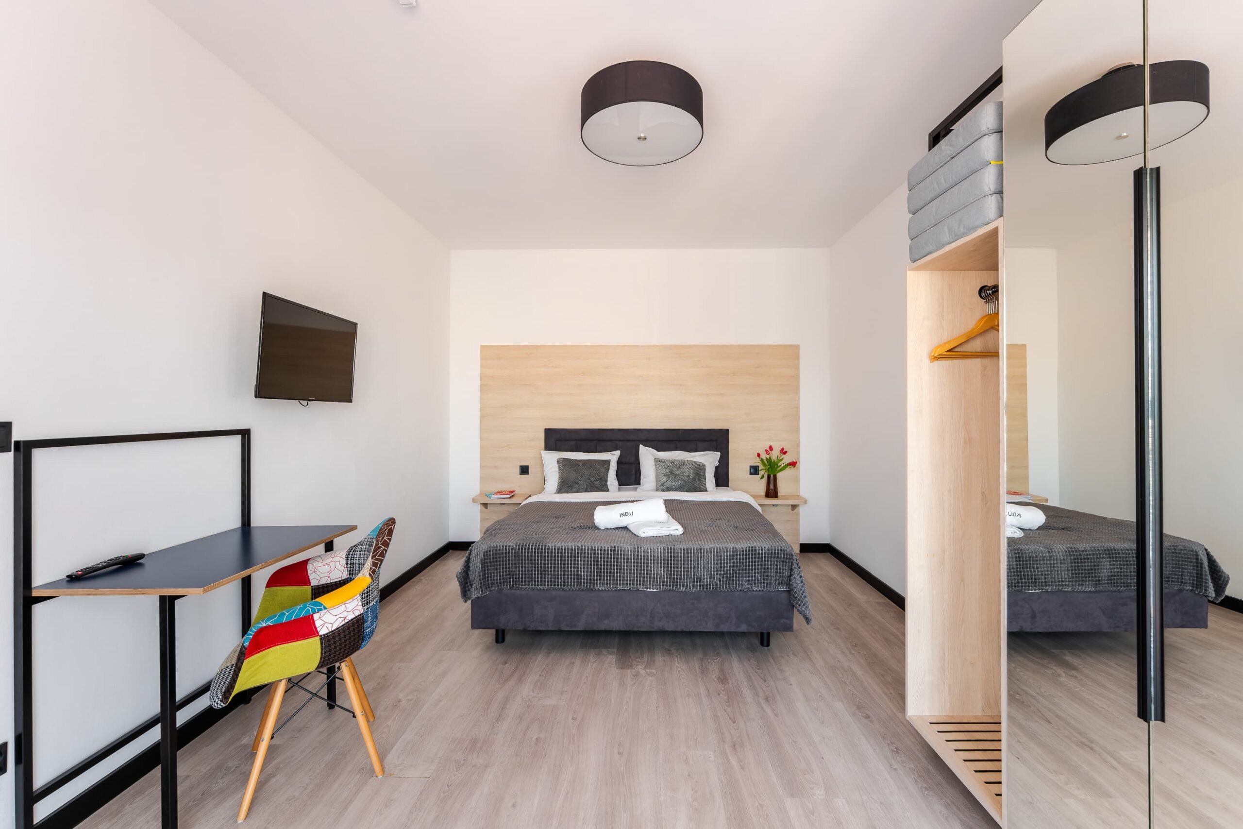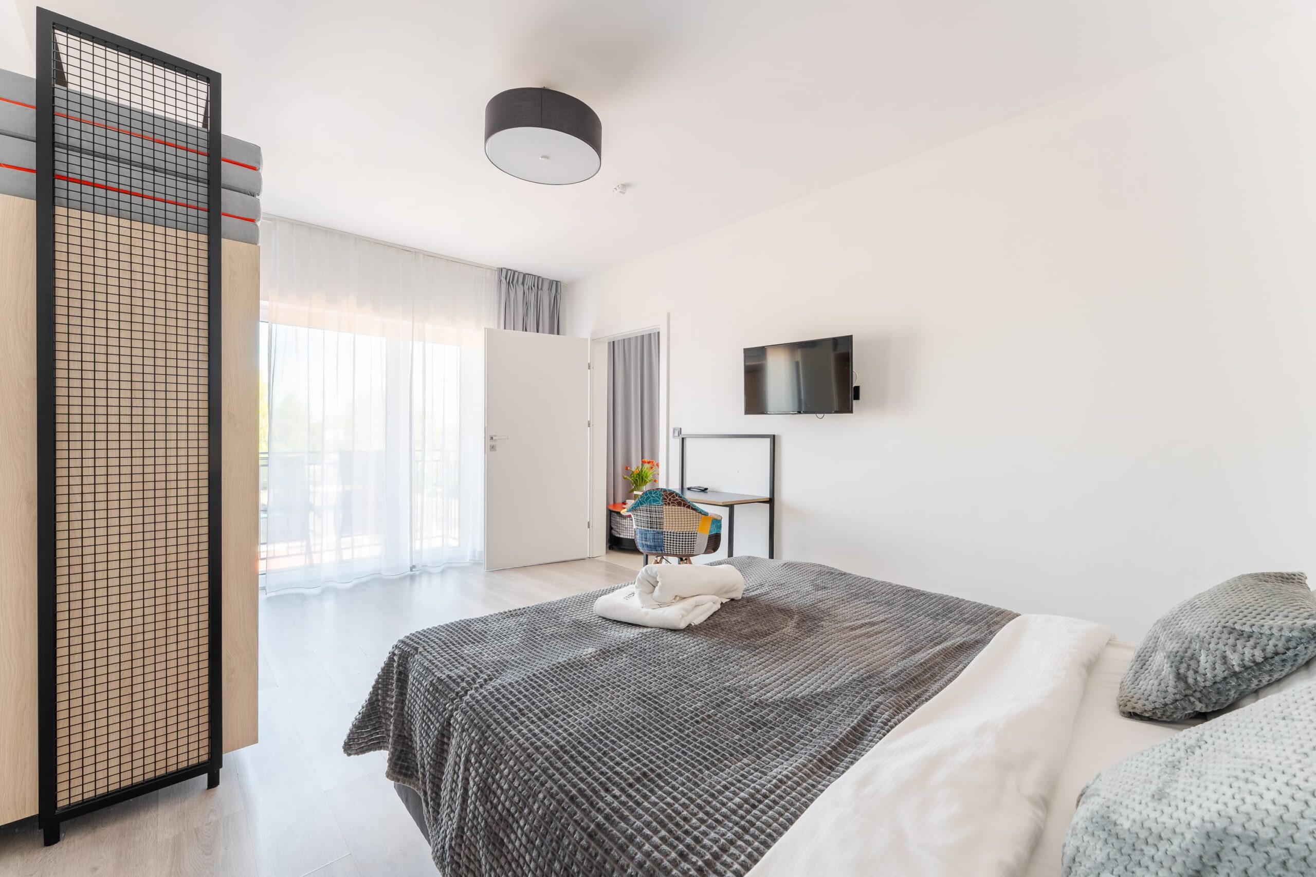 The room has a refrigerator, kitchenette, flat-screen TVwith cable channels, and a bathroom with a shower. The sofa bed with a mattress in the living room is an ideal solution for smaller spaces. The bedroom has a comfortable double bed.