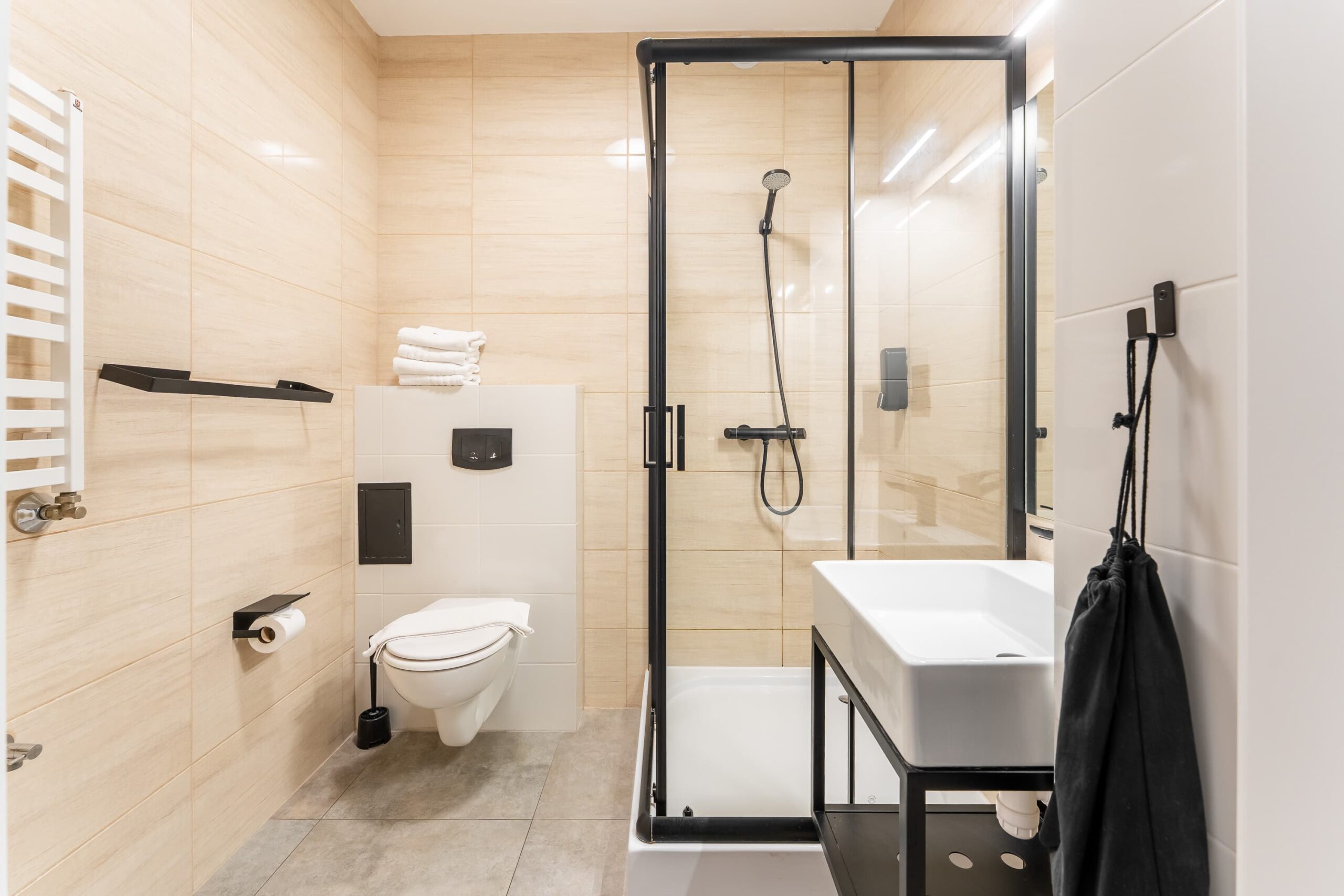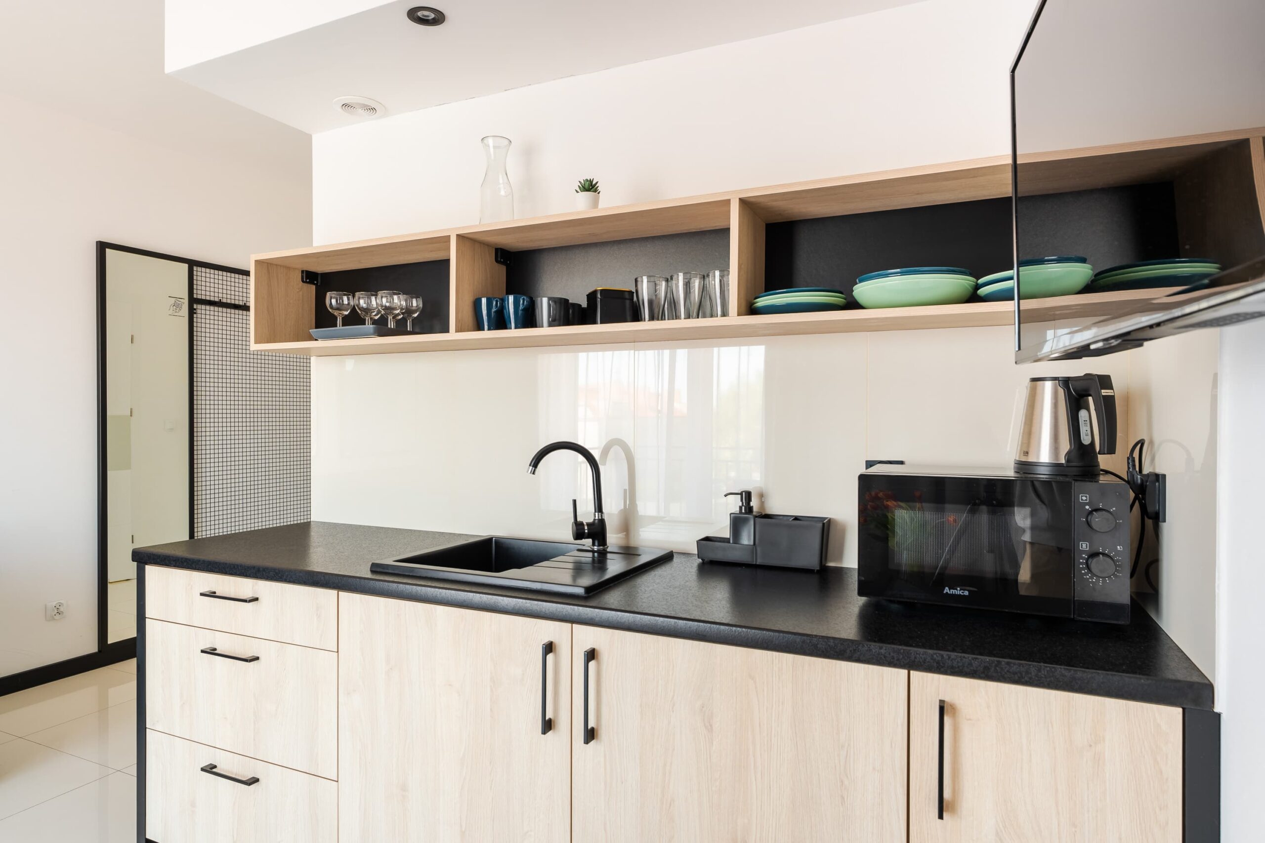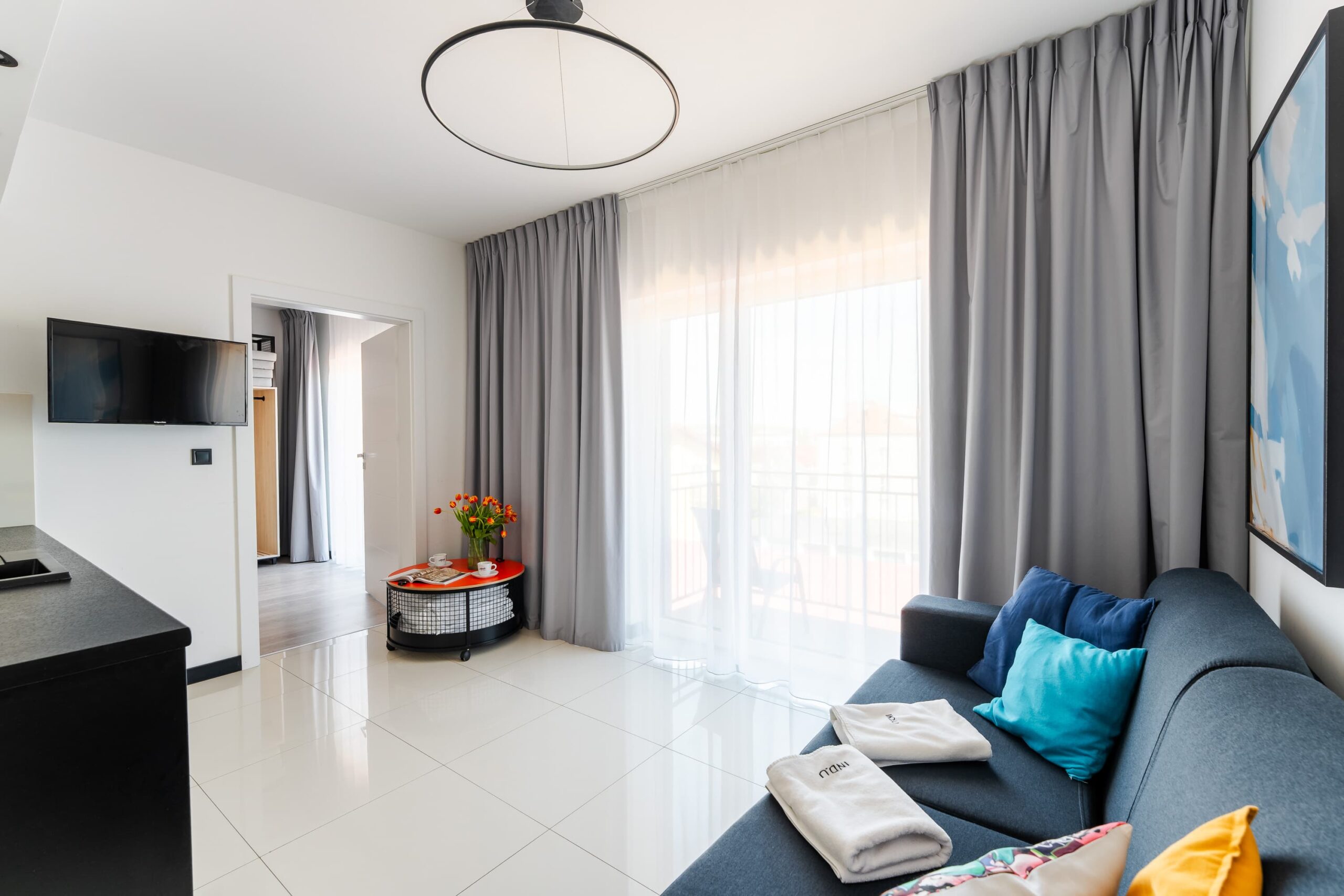 The room has a refrigerator, kitchenette, flat-screen TVwith cable channels, and a bathroom with a shower. The sofa bed with a mattress in the living room is an ideal solution for smaller spaces. The bedroom has a comfortable double bed.